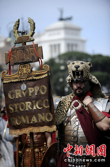 4月18日,意大利羅馬,男子打扮成武士在圓形競(jìng)技場(chǎng)附近參加游行,慶祝羅馬建城2763周年。圖片來源:中國新聞網(wǎng)