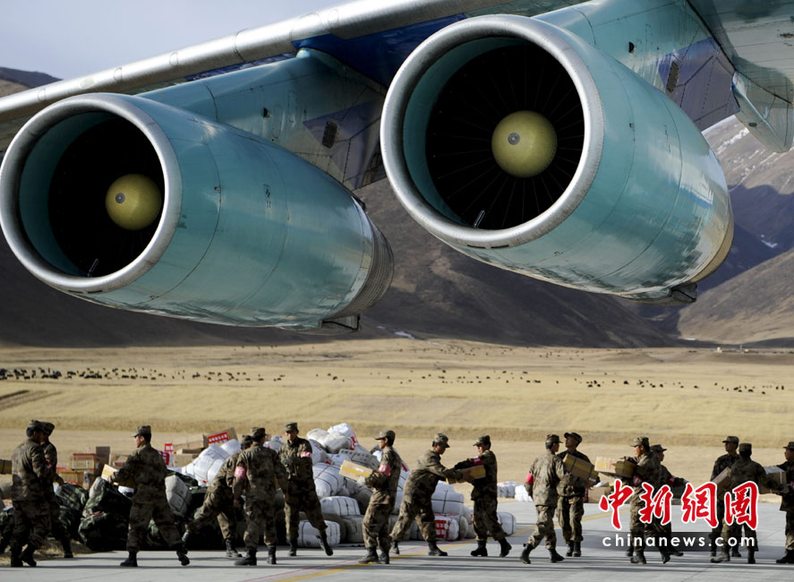 4月19日,玉樹機(jī)場,士兵們正從空軍飛機(jī)上卸載物資。據(jù)統(tǒng)計(jì),截至18日,空軍已出動(dòng)8架大型運(yùn)輸機(jī),飛行152架次,運(yùn)送救援人員2950人、傷員1640人、物資930噸。中新社發(fā) 廖攀 攝