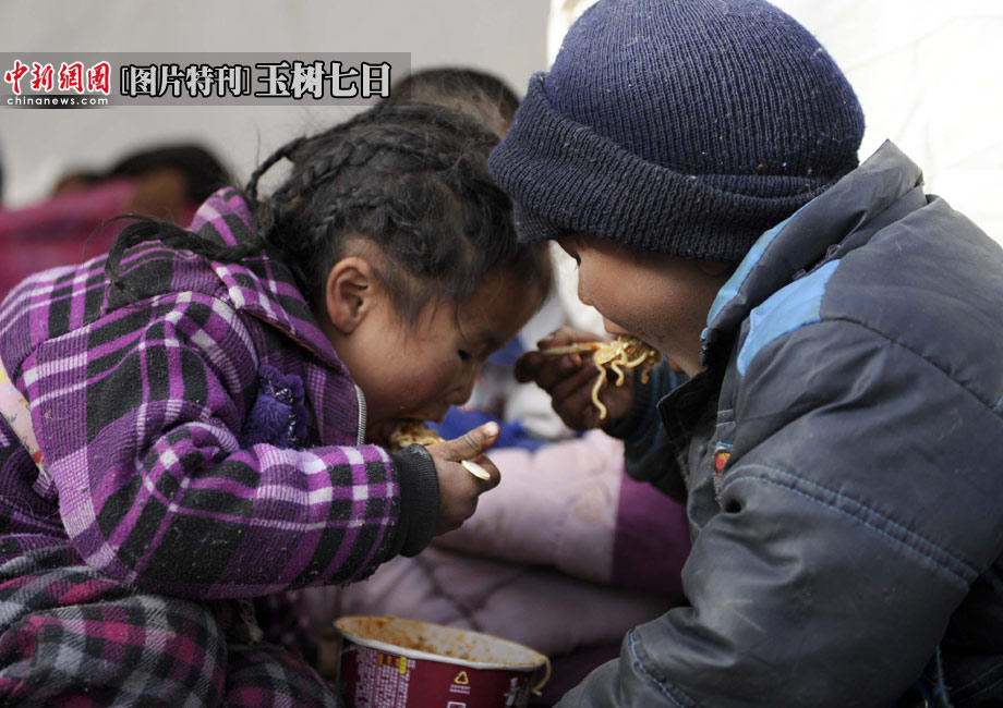 4月15日,青海玉樹縣體育場(chǎng)的地震災(zāi)民安置點(diǎn),兩名受災(zāi)孩童分食一盒方便面,一根不剩。中新社發(fā) 廖攀 攝