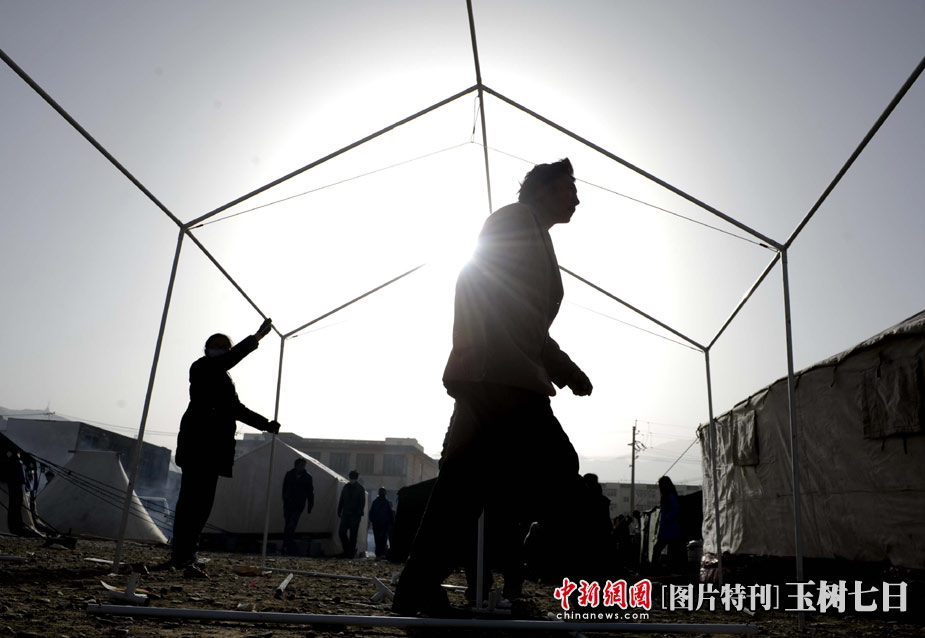 青海玉樹縣體育場(chǎng)的地震災(zāi)民安置點(diǎn)內(nèi),玉樹地震災(zāi)民正在積極自建抗震帳棚。中新社發(fā) 廖攀 攝