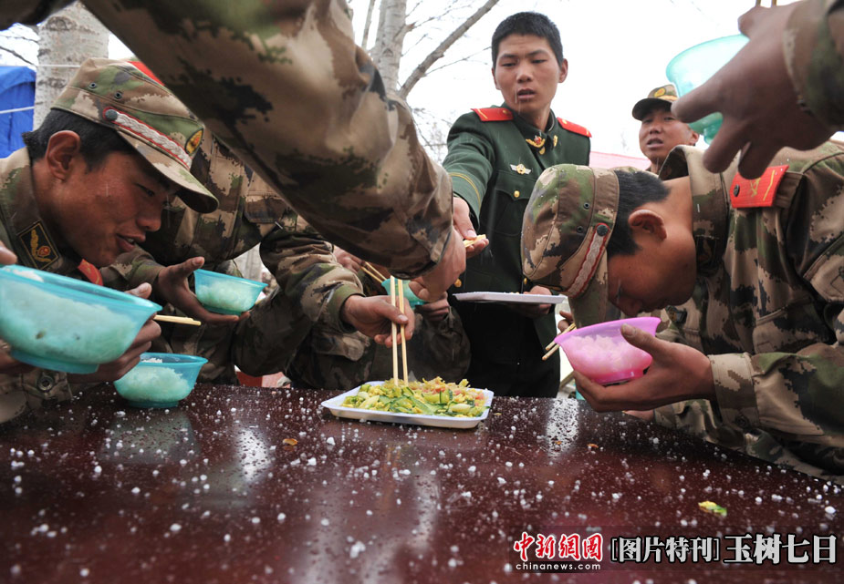 4月20日中午時(shí)分,玉樹地震災(zāi)區(qū)突然雷雹交加,正在現(xiàn)場(chǎng)救援的青海武警總隊(duì)官兵只能在冰雹中吃午餐。中新社發(fā) 賈國(guó)榮 攝