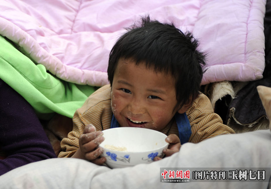 災(zāi)難的來(lái)臨無(wú)法選擇,但是面對(duì)災(zāi)難的方式,卻始終掌握在每個(gè)人自己手中。家園被毀,失去親人,傷痛過(guò)后生活還要繼續(xù),愿玉樹的受災(zāi)群眾選擇堅(jiān)強(qiáng),用堅(jiān)韌和信心去開(kāi)創(chuàng)新的生活。 圖為青海玉樹體育場(chǎng)地震民眾安置點(diǎn),一名孩童歡快地吃東西。中新社發(fā) 廖攀 攝