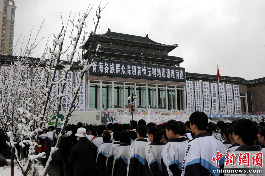 21日上午9時(shí)許,西寧各界民眾冒雪陸續(xù)來到該市最大的廣場——新寧廣場,悼念玉樹地震遇難同胞。中新社記者 符永康 攝