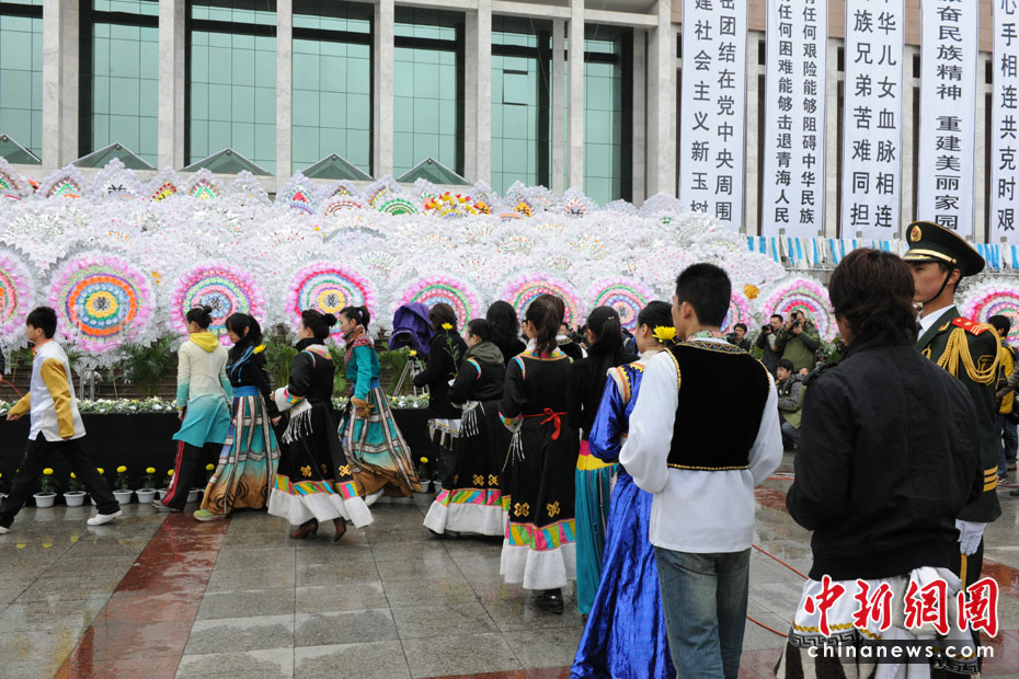 21日上午9時(shí)許,西寧各界民眾冒雪陸續(xù)來到該市最大的廣場——新寧廣場,悼念玉樹地震遇難同胞。中新社記者 符永康 攝