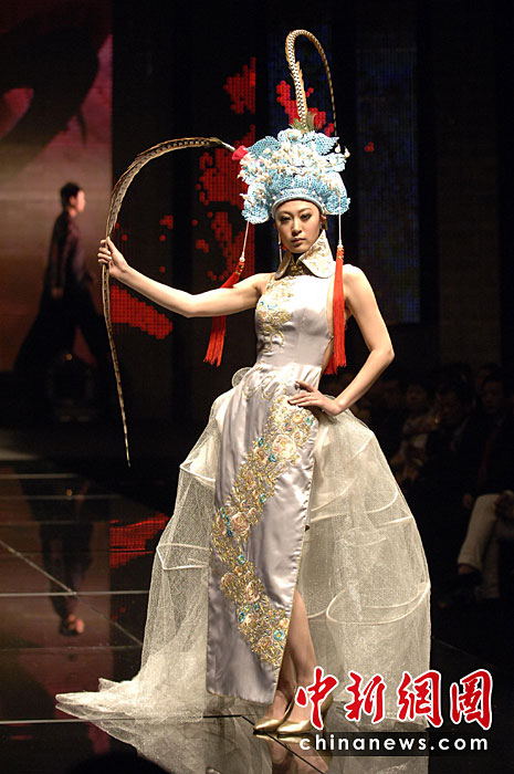 4月20日晚,首屆海西國際時裝周在福建石獅閉幕,本屆時裝周吸引了來自海峽兩岸的紡織服裝界企業(yè)家和知名服裝設(shè)計(jì)師。期間舉辦了12場時裝品牌和設(shè)計(jì)師作品動態(tài)發(fā)布會。圖為模特展示古今潮流結(jié)合的服裝。王東明 攝