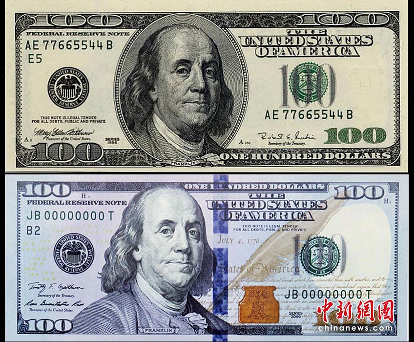 4月21日,美國財政部和美聯(lián)儲共同發(fā)布新版100美元面值的紙幣票樣。此次發(fā)行新版百元美鈔旨在防范假鈔,同時,老版美元仍將繼續(xù)流通。圖片來源:中國新聞網(wǎng)