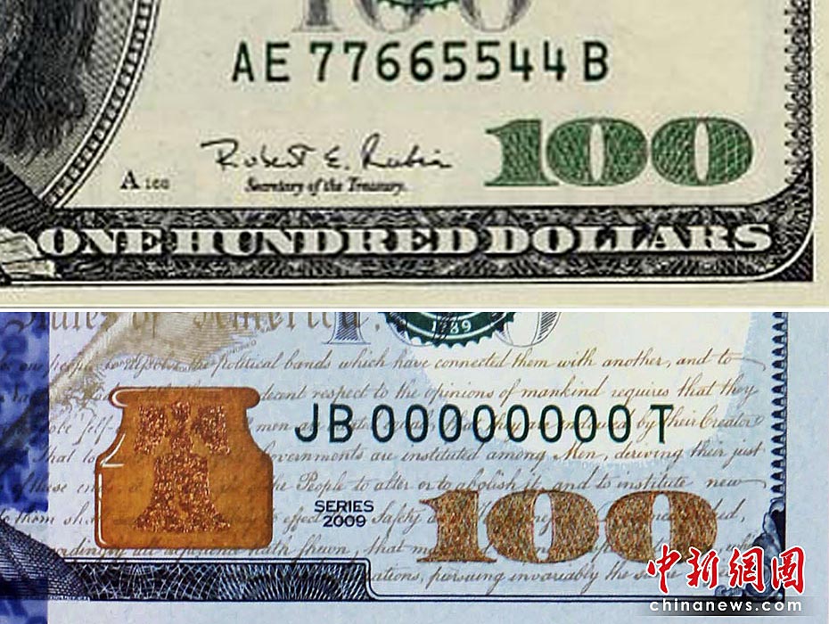 4月21日,美國(guó)財(cái)政部和美聯(lián)儲(chǔ)共同發(fā)布新版100美元面值的紙幣票樣。此次發(fā)行新版百元美鈔旨在防范假鈔,同時(shí),老版美元仍將繼續(xù)流通。圖片來源:中國(guó)新聞網(wǎng)