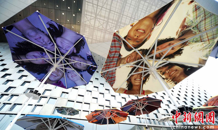 2010年4月22日,上海世博會主題館門前的觀眾等候區(qū),豎立著一把把遮陽的花傘,每一把花傘上都印著四方友人的燦爛微笑。世博園區(qū)為了應(yīng)對大量客流,園區(qū)設(shè)置了大量遮陽和避雨設(shè)施,遮陽避雨面積總量達(dá)40萬平方米。楊毅 攝