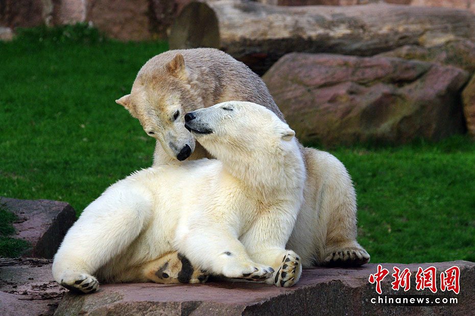 4月23日,德國紐倫堡動物園內(nèi),兩頭北極熊在公園內(nèi)的水池中盡情玩耍,享受春天的陽光。圖片來源:中國新聞網(wǎng)