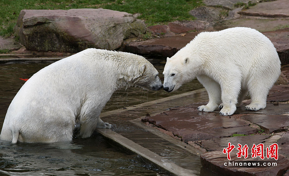 4月23日,德國紐倫堡動物園內,兩頭北極熊在公園內的水池中盡情玩耍,享受春天的陽光。圖片來源:中國新聞網(wǎng)