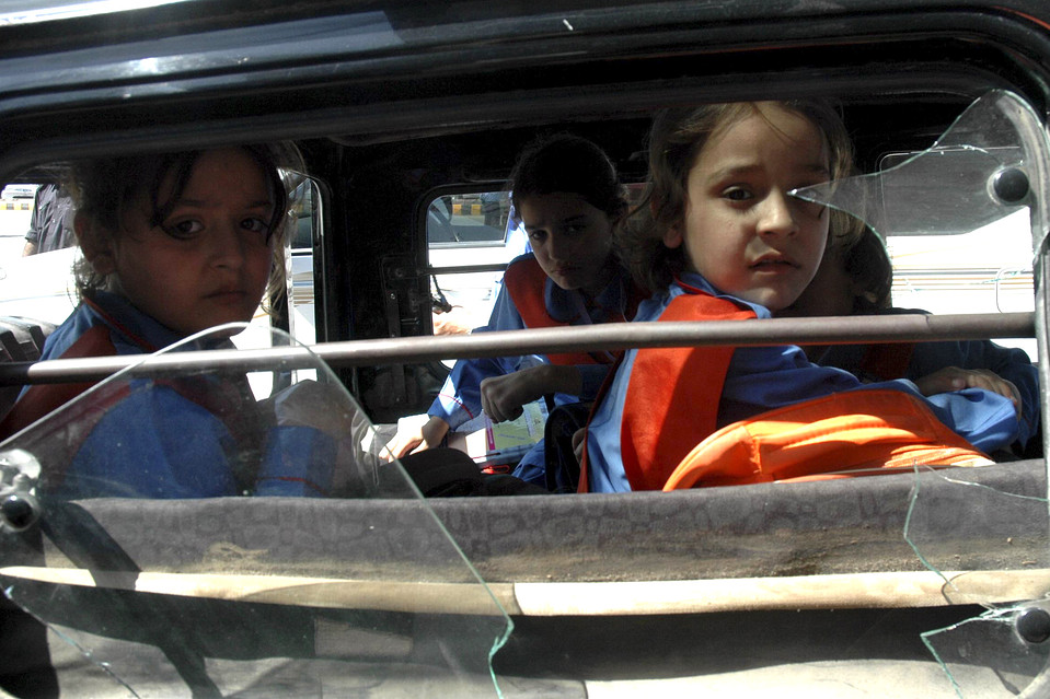 周一(19日),巴基斯坦白沙瓦發(fā)生炸彈爆炸事件。圖為學(xué)生坐在炸彈攻擊后的車內(nèi)。