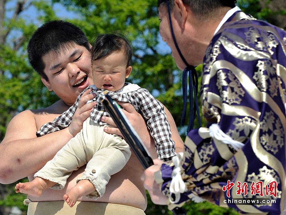 4月25日,日本東京,幾名相撲手手抱嬰兒,正努力使嬰兒哭泣。當(dāng)日,一年一度的日本一周歲以下嬰兒啼哭大賽在東京淺草寺舉行。第一個(gè)讓嬰兒哭泣的選手將贏得比賽,日本通過此種比賽為孩子的健康祈福,他們認(rèn)為嬰兒哭泣將對他們將來的身體健康有利。圖片來源:中國新聞網(wǎng)