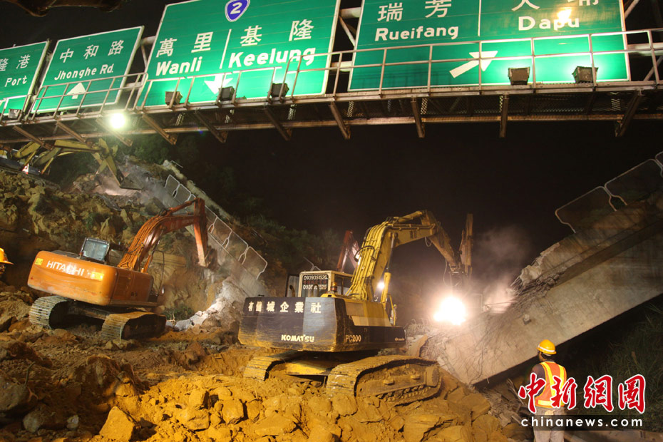4月25日, 臺灣一條交通要道、“北二高”基隆段發(fā)生山崩意外,傾瀉而下的土石壓垮一座高架橋,并覆蓋道路約200米,據傳有人車被埋。圖為工程人員連夜開挖,展開大搜救。 中新社發(fā) 董會峰 攝