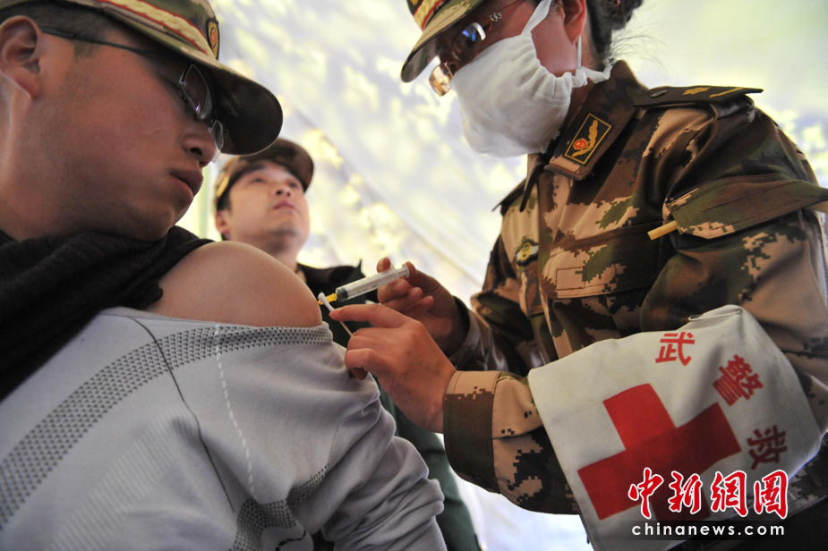 武警青?傟犪t(yī)院救護(hù)隊半夜為受傷的士兵補(bǔ)打疫苗。4月下旬的玉樹地震災(zāi)區(qū)急缺防疫藥品,中新社發(fā) 賈國榮 攝