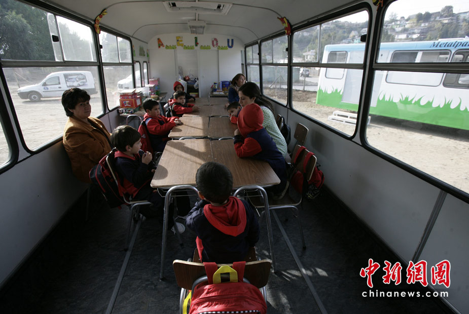 4月26日,今年2月遭受8.8級強烈地震的智利康塞普西翁市,兒童們在“巴士學(xué)!崩锷险n。