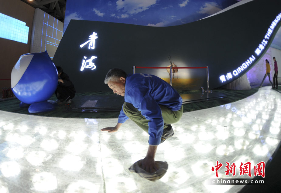 4月27日,中國省區(qū)市聯(lián)合館中的青海館,工作人員維護設施,展覽工作準備就緒。中新社發(fā) 廖攀 攝