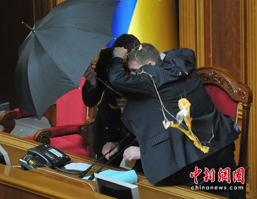 4月27日,基輔,烏克蘭議會(huì)就俄羅斯黑海艦隊(duì)駐扎問題進(jìn)行討論時(shí)出現(xiàn)混亂,數(shù)千人在議會(huì)外示威,會(huì)場內(nèi)有人投擲煙霧彈和雞蛋,大廳內(nèi)煙霧彌漫,場面一度混亂。圖為議長藏在傘后躲避不斷飛來的雞蛋。