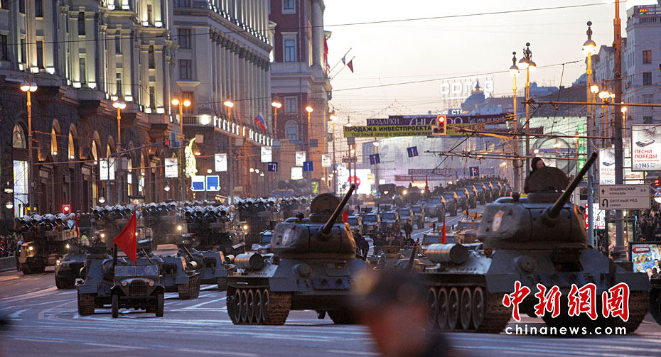 此次紅場閱兵包括兩部分內(nèi)容:歷史部分和現(xiàn)代部分。歷史部分由身穿衛(wèi)國戰(zhàn)爭時期軍服的士兵在鵝卵石道上進行,同時還會有9輛T-34坦克和8輛SU-100自行火炮。現(xiàn)代部分由13輛老虎裝甲車、BTR-80裝甲車、BMP-3步兵戰(zhàn)車、T-90A坦克和S-400防空系統(tǒng)等。圖片來源:中國新聞網(wǎng)