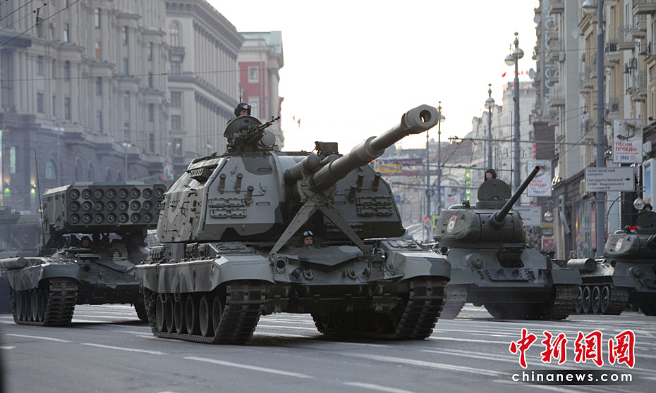 此次紅場(chǎng)閱兵包括兩部分內(nèi)容:歷史部分和現(xiàn)代部分。歷史部分由身穿衛(wèi)國(guó)戰(zhàn)爭(zhēng)時(shí)期軍服的士兵在鵝卵石道上進(jìn)行,同時(shí)還會(huì)有9輛T-34坦克和8輛SU-100自行火炮。現(xiàn)代部分由13輛老虎裝甲車、BTR-80裝甲車、BMP-3步兵戰(zhàn)車、T-90A坦克和S-400防空系統(tǒng)等。圖片來(lái)源:中國(guó)新聞網(wǎng)
