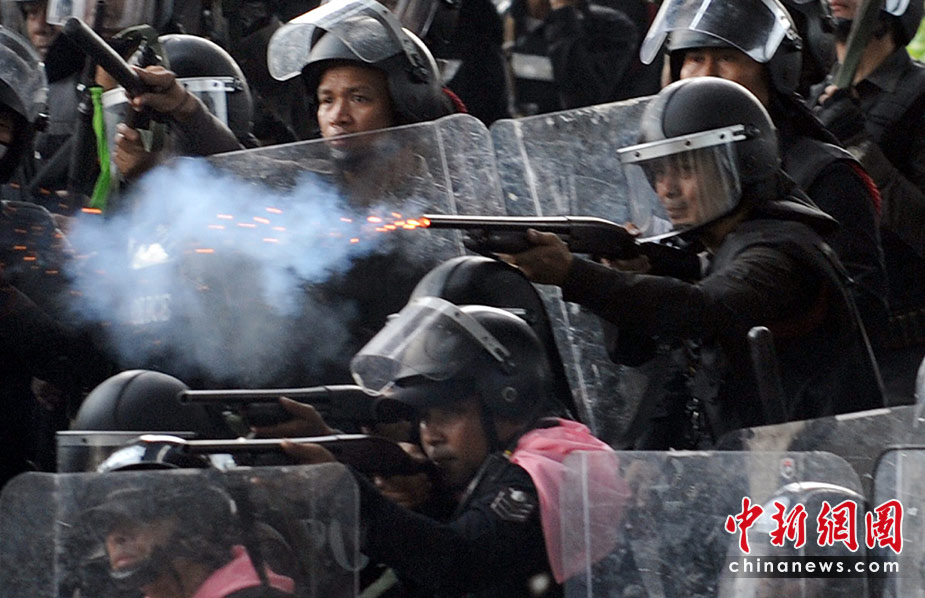 泰國(guó)防暴警察與紅衫軍示威民眾28日下午爆發(fā)沖突,1名士兵頭部被擊中身受重傷,10名示威民眾受傷送醫(yī)。