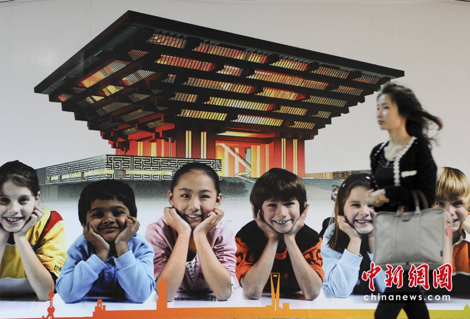 4月29日,一位女士經(jīng)過(guò)上海地鐵通道里的世博會(huì)海報(bào)前。世博會(huì)開(kāi)幕前,面臨“大考”的上海充滿喜慶氣氛。 中新社發(fā) 廖攀 攝