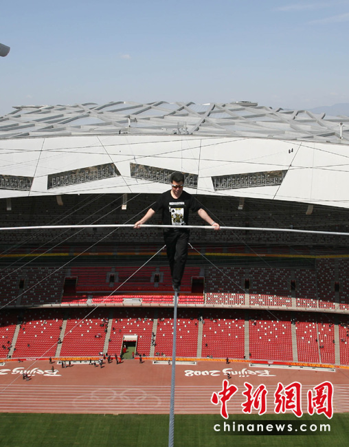 4月29日,有高空王子之稱的新疆小伙阿迪力在鳥(niǎo)巢上空成功試演達(dá)瓦孜(高空走鋼絲)。5月3日起,他將在北京國(guó)家體育場(chǎng)(鳥(niǎo)巢)頂棚上搭建的小屋生存60天,其間每天將進(jìn)行約5個(gè)小時(shí)的高空走鋼絲表演。 中新社發(fā) 蘇丹 攝