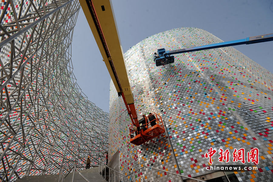 4月29日,工人在對拉脫維亞館的外墻進(jìn)行美化。秦淮 攝