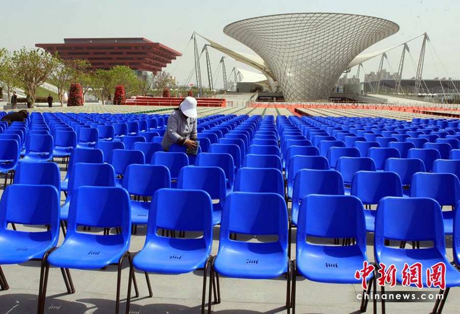 4月29日,上海世博園慶典廣場(chǎng),一位工作人員正在擦拭開幕式煙花表演的觀眾席座椅。吳煌 攝