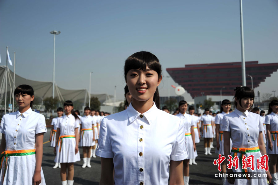 4月30日晚,舉世矚目的上海世博會(huì)開幕式將在黃浦江畔世博園區(qū)舉行。圖為上海世博會(huì)禮儀小姐正在做最后準(zhǔn)備。中新社發(fā) 許康平 攝