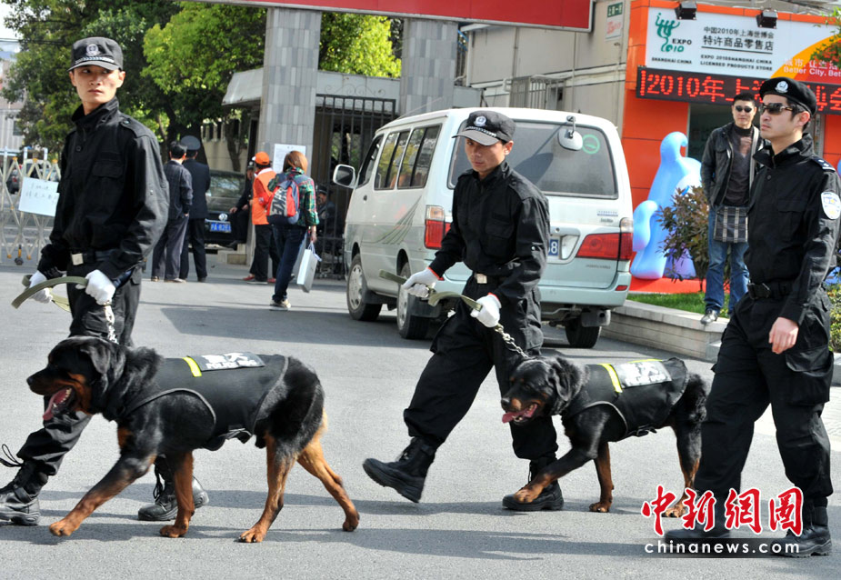 4月30日晚,舉世矚目的上海世博會(huì)開(kāi)幕式將在黃浦江畔世博園區(qū)舉行。 4月30日上午,上海警察攜警犬在世博園周?chē)策墶V行律绨l(fā) 賈國(guó)榮 攝
