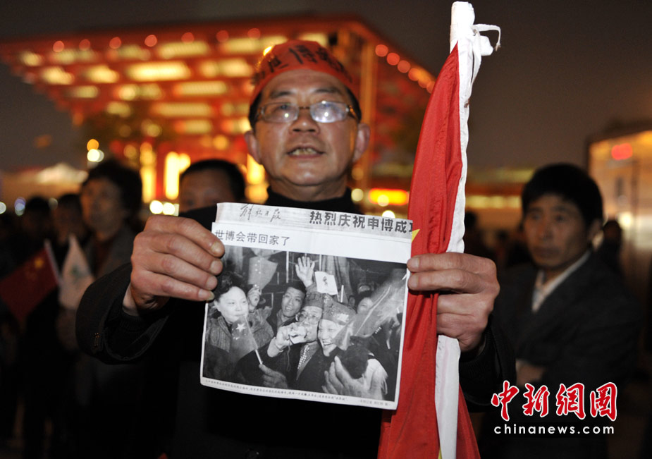 30日晚上8時,2010年上海世博會正式拉開帷幕。60多歲的俞大爺頭上戴著寫有“為世博喝彩!”的頭箍。他告訴記者,8年前,世博申辦成功的時候,他也曾經(jīng)戴過這樣一個頭箍,上面寫著“我們成功了!”圖為俞大爺展示8年前申博成功時報紙上登的他的照片。中新網(wǎng)記者 王紅綱 攝