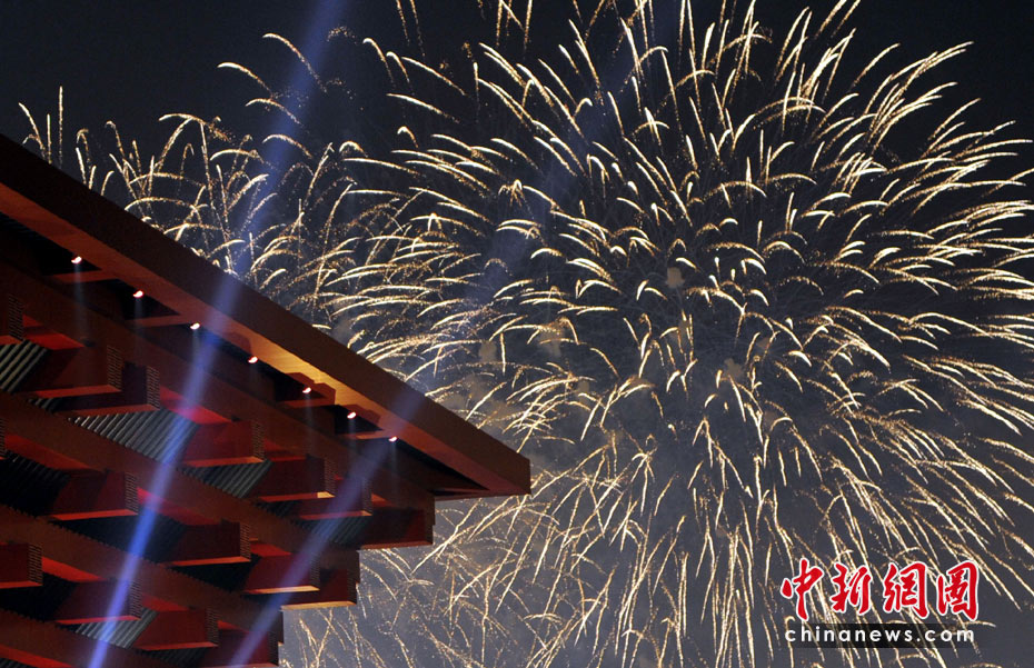 4月30日晚,2010年上海世博會開幕式在上海世博園世博文化中心舉行。21時28分,世博會焰火燈光表演開始。黃浦江兩岸綿延3.28公里同時奏響火樹銀花不夜天的華彩世博樂章。中新網(wǎng)記者 王紅綱 攝