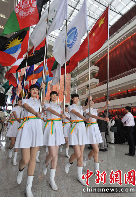 5月1日,上海世博會(huì)舉行開(kāi)園儀式,美女旗手高舉參展國(guó)家和地區(qū)、組織的旗幟入場(chǎng)。中新社發(fā) 賈國(guó)榮 攝