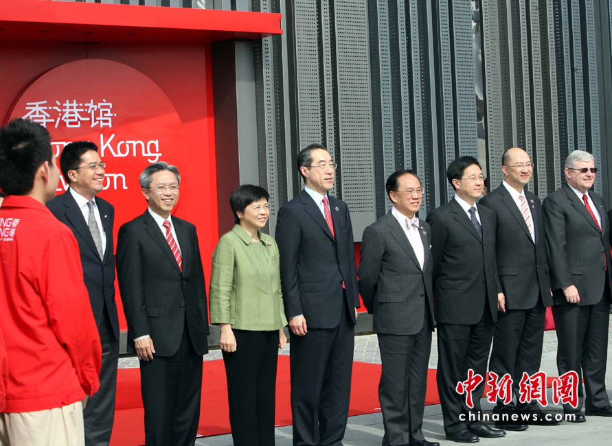 5月1日,上海世博園內(nèi)的香港館開幕,香港特首曾蔭權(quán)(右四)率特區(qū)政府官員出席開幕儀式。中新社發(fā) 洪少葵 攝