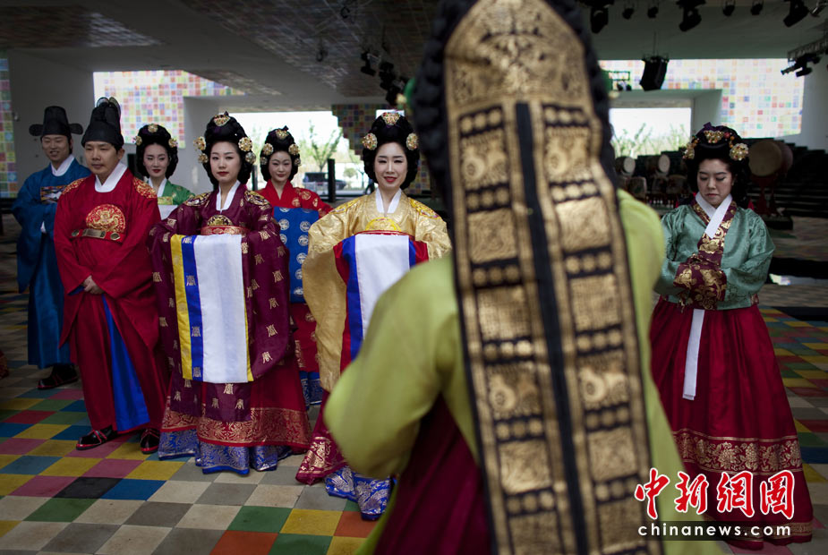 5月1日,上海世博會(huì)正式開園迎客,首批游客入園參觀。圖為在韓國(guó)館內(nèi)接待人員靜候前來(lái)參觀的游客。