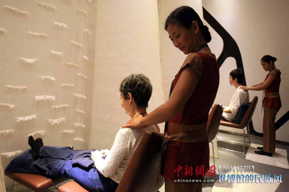 5月1日,上海世博會菲律賓館開館,其館內(nèi)設(shè)置的傳統(tǒng)按摩深受參觀者歡迎,一早便預(yù)約完畢。中新社發(fā) 潘索菲 攝