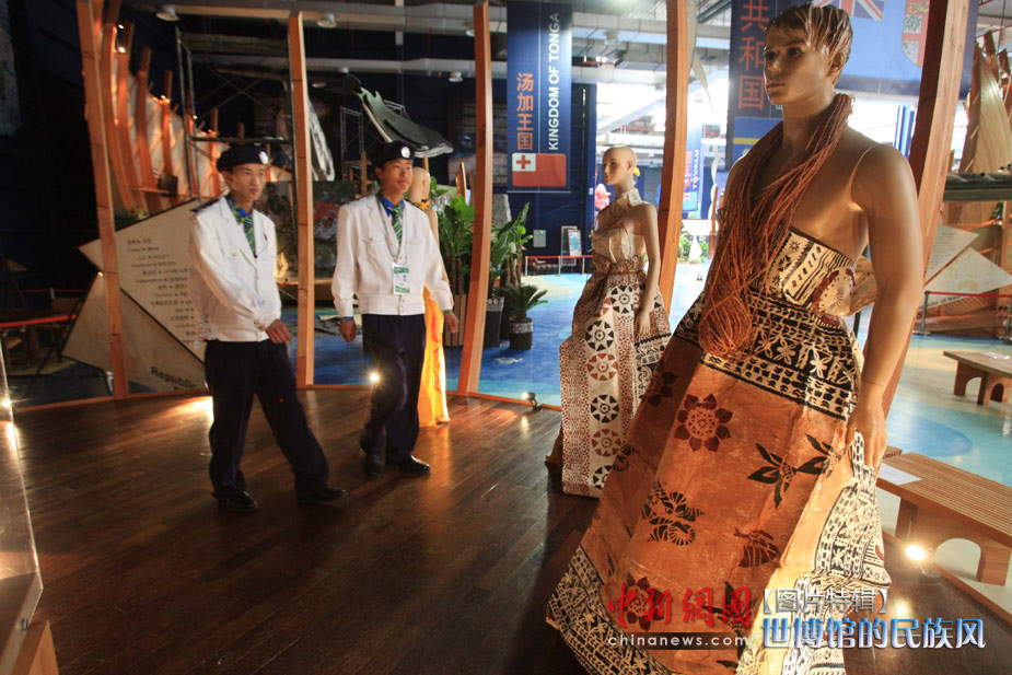 5月1日,上海世博會(huì)開(kāi)園第一天,斐濟(jì)國(guó)的手繪樹(shù)皮時(shí)裝在太平洋聯(lián)合館展出。中新社發(fā) 潘索菲 攝