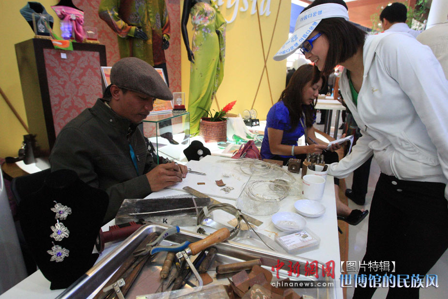 5月1日,上海世博會(huì)馬來(lái)西亞館開館,手工藝人用金銀絲打造漂亮的胸針,讓參觀者驚訝不已。中新社發(fā) 潘索菲 攝。