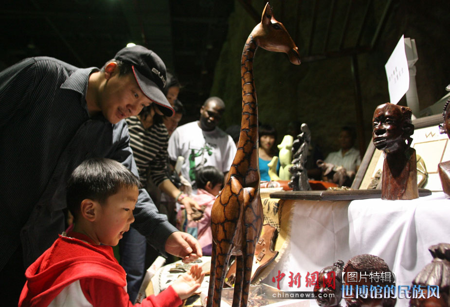 5月1日,上海世博會開園第一天,非洲聯(lián)合館內(nèi)陳設的工藝品吸引了一對父子游客。中新社發(fā) 蘇丹 攝