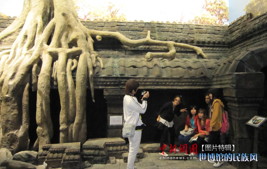 5月1日世博會開園首日,柬埔寨館內(nèi)復制的塔布籠寺大樹成中國游客留影最多的場景。塔布籠寺那棵長在建筑中間的大樹因為美國電影“古墓麗影”而被中國人所熟知。 中新社發(fā) 姜煜 攝