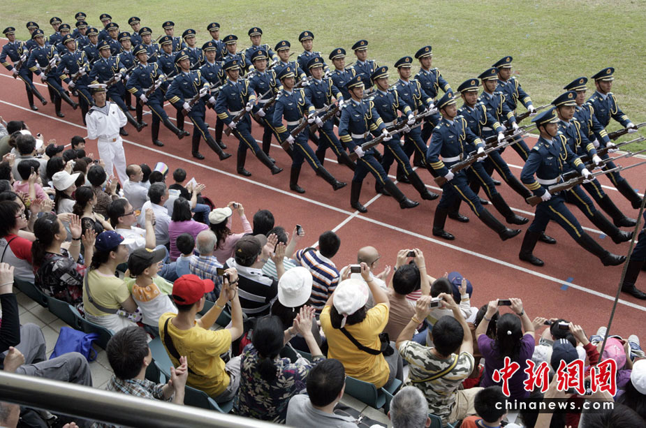 為慶祝“五一”國(guó)際勞動(dòng)節(jié),進(jìn)一步增進(jìn)與香港社會(huì)各界相互溝通與交流,中國(guó)人民解放軍駐香港部隊(duì)5月1日開(kāi)放了昂船洲軍營(yíng)。圖為香港市民們爭(zhēng)睹駐港部隊(duì)三軍儀仗隊(duì)風(fēng)姿。中新社發(fā) 張勤 攝