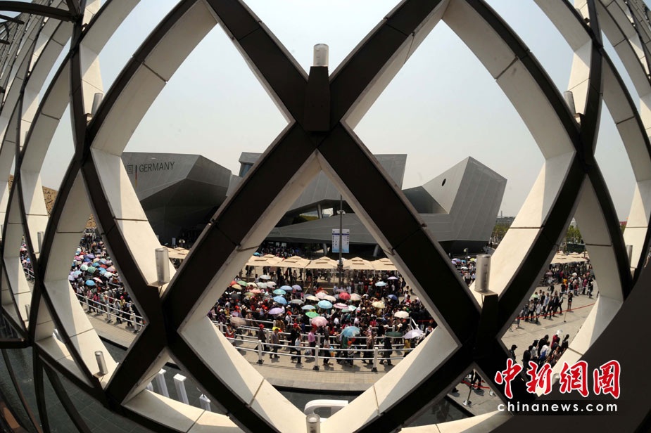 5月2日,上海世博園開園第二天迎來(lái)客流高峰。在正午的陽(yáng)光下,從法國(guó)館的藝術(shù)格柵中眺望德國(guó)館,別有一番景觀。 中新社發(fā) 廖攀 攝