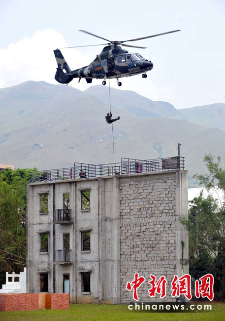 為慶祝“五一”國(guó)際勞動(dòng)節(jié),進(jìn)一步增進(jìn)與香港社會(huì)各界相互溝通與交流,中國(guó)人民解放軍駐香港部隊(duì)5月2日開放了石崗軍營(yíng)。圖為駐港部隊(duì)反恐突擊和陸空協(xié)同救援演練表演。 中新社發(fā) 鄧慶樂 攝