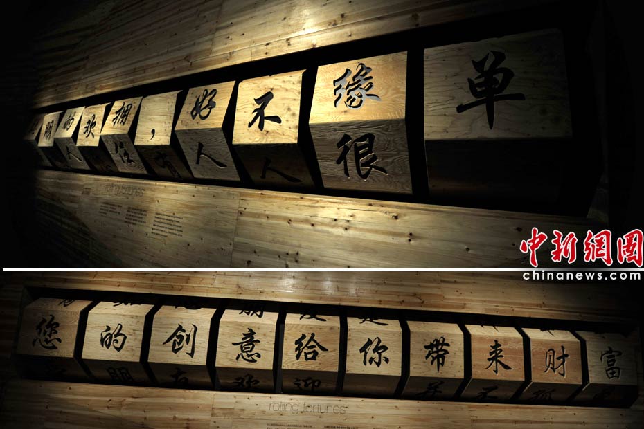 互動體驗游戲——游客每拉一下?lián)u桿,會使墻上的木制滾動機(jī)滾動,滾動機(jī)是由各種漢字組成,每次都會出現(xiàn)一句諸如“您的創(chuàng)意給您帶來財富”這樣的吉利話,很討游客的歡心。中新網(wǎng)記者 王紅綱 攝