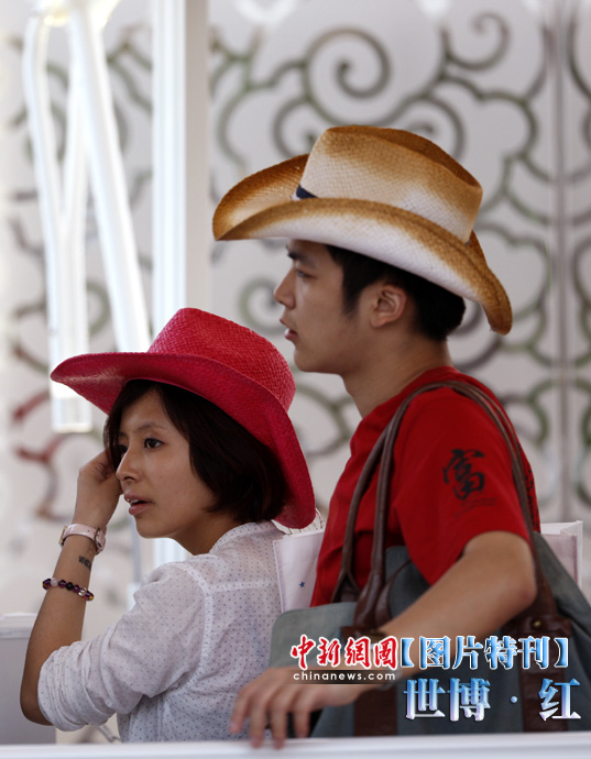 紅色象征著熱量與活力,紅色也象征著興奮與激情,在世博園區(qū)內(nèi)游覽,總會(huì)有一抹濃艷的紅色闖入到記者鏡頭之中,讓世博變得更加火辣。圖為著裝時(shí)尚的游客。中新社記者 盛佳鵬 攝