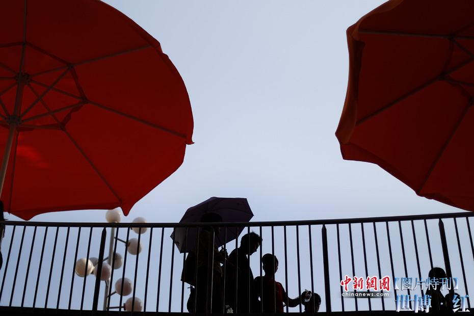 紅色象征著熱量與活力,紅色也象征著興奮與激情,在世博園區(qū)內游覽,總會有一抹濃艷的紅色闖入到記者鏡頭之中,讓世博變得更加火辣。圖為紅傘下的游客。中新社記者 盛佳鵬 攝