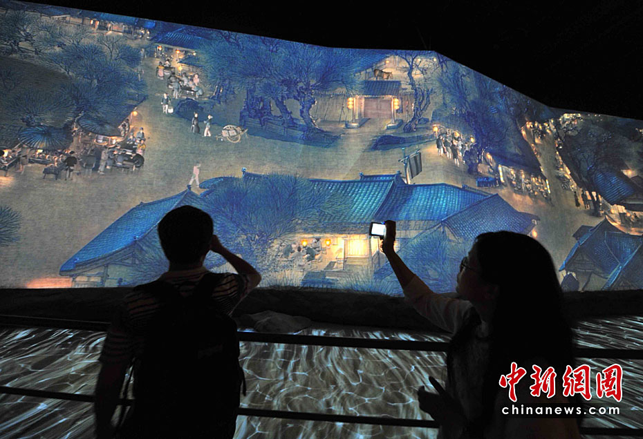 5月2日,中外觀眾依然最熱捧上海世博會中國館的“鎮(zhèn)館之寶”——巨幅放大電子動態(tài)版的北宋畫家張擇端名作《清明上河圖》。此世博版的《清明上河圖》高6.3米,長130余米,約是原圖的30倍,需要12臺電影級的投影儀同時工作。整個活動畫面以4分鐘為一個周期,盡展宋朝盛世的都市日夜風(fēng)情。中新社記者 賈國榮 攝