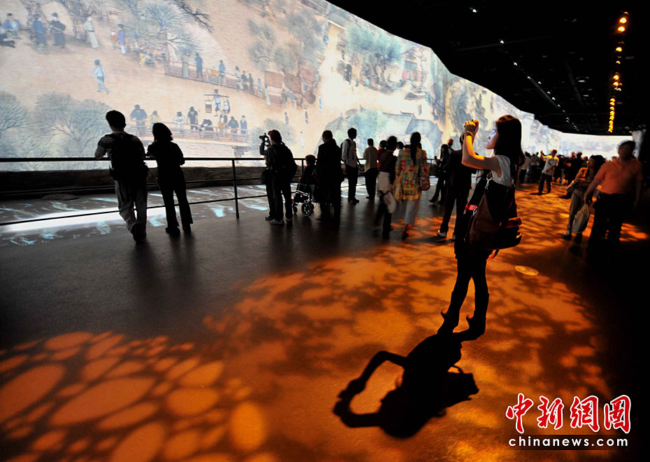 5月2日,中外觀眾依然最熱捧上海世博會(huì)中國(guó)館的“鎮(zhèn)館之寶”——巨幅放大電子動(dòng)態(tài)版的北宋畫家張擇端名作《清明上河圖》。此世博版的《清明上河圖》高6.3米,長(zhǎng)130余米,約是原圖的30倍,需要12臺(tái)電影級(jí)的投影儀同時(shí)工作。整個(gè)活動(dòng)畫面以4分鐘為一個(gè)周期,盡展宋朝盛世的都市日夜風(fēng)情。中新社記者 賈國(guó)榮 攝