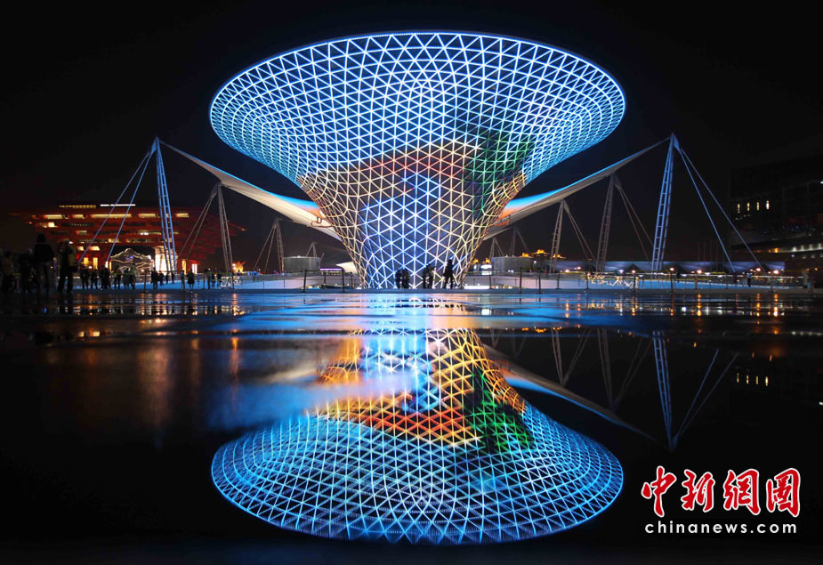 夜幕下的上海世博園區(qū)處處流露光華與璀璨,世博軸上的“陽(yáng)光谷”成為一個(gè)個(gè)流光溢彩的“夜光杯”,以不同色調(diào)交織成流動(dòng)的光影旋律,給游客們帶來(lái)難以忘懷的感受。中新社發(fā) 宗金柱 攝