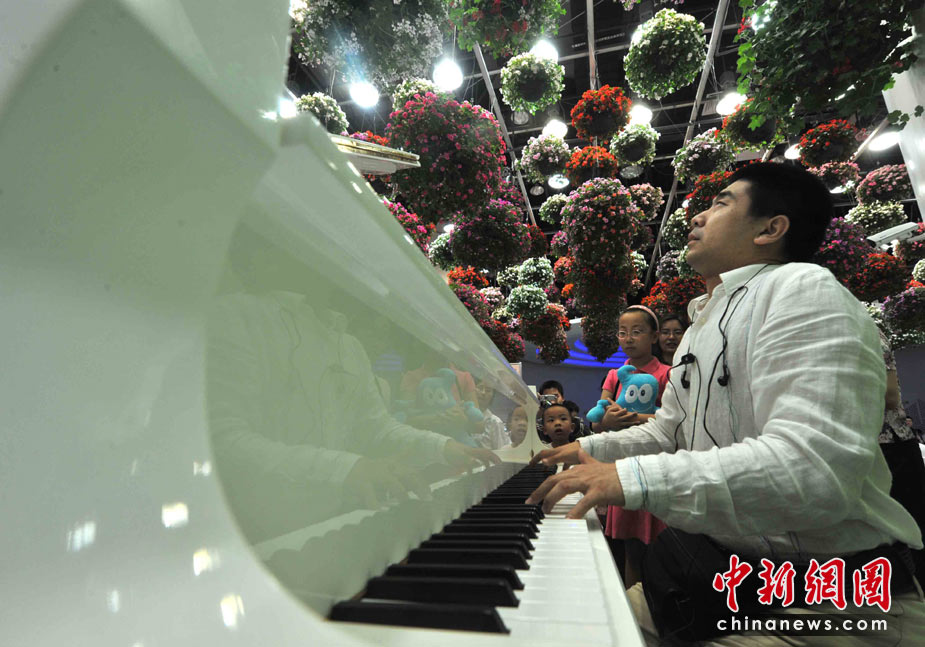 5月4日是上海世博會(huì)第四天,盲人鋼琴家孫巖在生命陽光館專設(shè)區(qū)域?yàn)楸姸鄽埣踩撕陀^眾演奏,導(dǎo)盲犬靜臥在他的腳邊,這是世博會(huì)歷史上第一次為殘疾人設(shè)館。孫巖2005年獲得“日本橫濱第一屆國(guó)際殘疾人鋼琴比賽”金獎(jiǎng),他是中央音樂學(xué)院有史以來第一位盲人大學(xué)生和研究生。他的傾情演奏感動(dòng)全場(chǎng),掌聲連連。中新社發(fā) 賈國(guó)榮 攝
